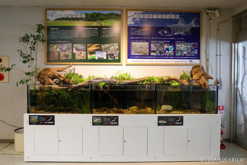 また、水槽上部には日本の里山に生息する身近な生きものたちの保全について記したパネルと、鳥羽水族館で20年以上にわたり積極的に実施してきたウシモツゴの保全活動についても紹介しています。