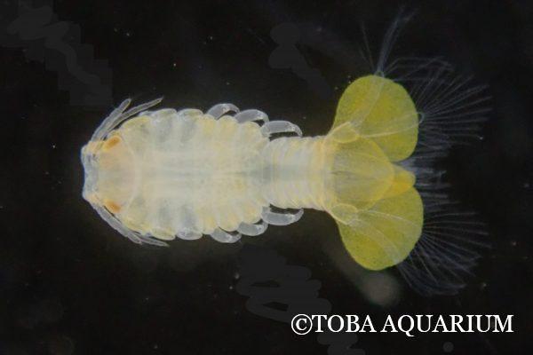 鮮やかな黄色の体色で、尾びれのように広がった第5腹肢を使って活発に泳いでいました。こんな形のマンカ幼生は他で見たことがありません!