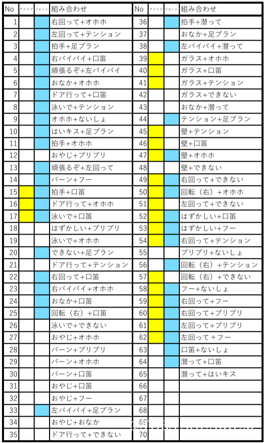 せっかくなので、コンビネーションの一覧表を公開したいと思います!