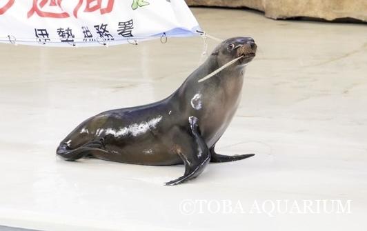 セイウチのツララは、お水を口からピューっと吹いて垂れ幕を下ろしてくれるのですが