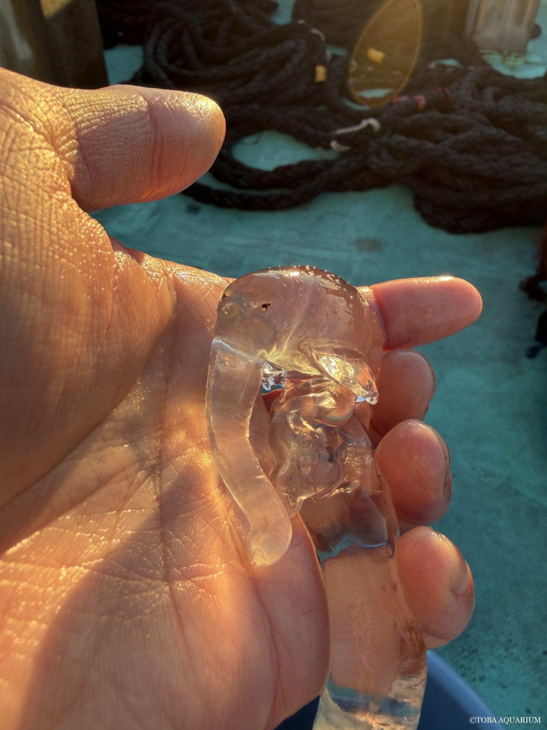 すると、なにか透明な細長いものが漂っている。クラゲか?いや、ゾウクラゲや!いやいや、ハダカゾウクラゲや!!