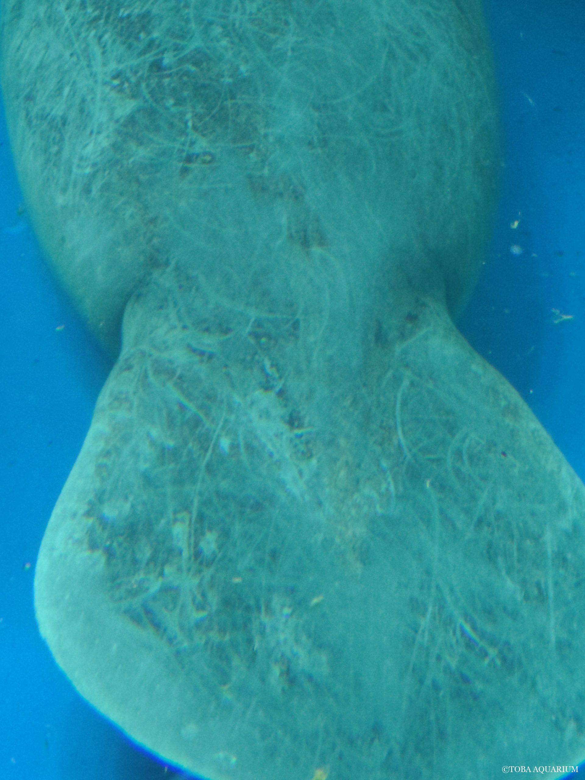 いつもは汚れがひどくなる前に底の擬岩などに体を擦って、背中や尾びれをキレイに磨いているのですが、ごく稀に体の汚れをためてしまい体中が黒色になってきます。