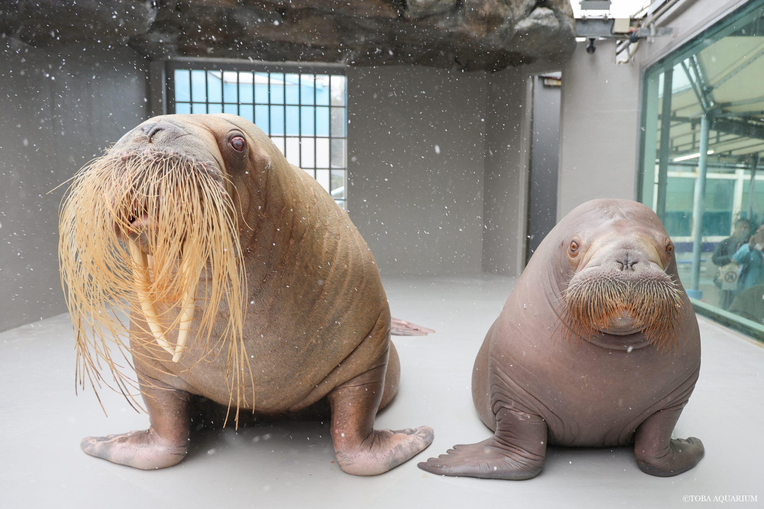 雪が少しだけ積もった鳥羽水族館では、ポウちゃんが雪を食べ、ツララも雪を食べ、いちこも雪を食べていました。