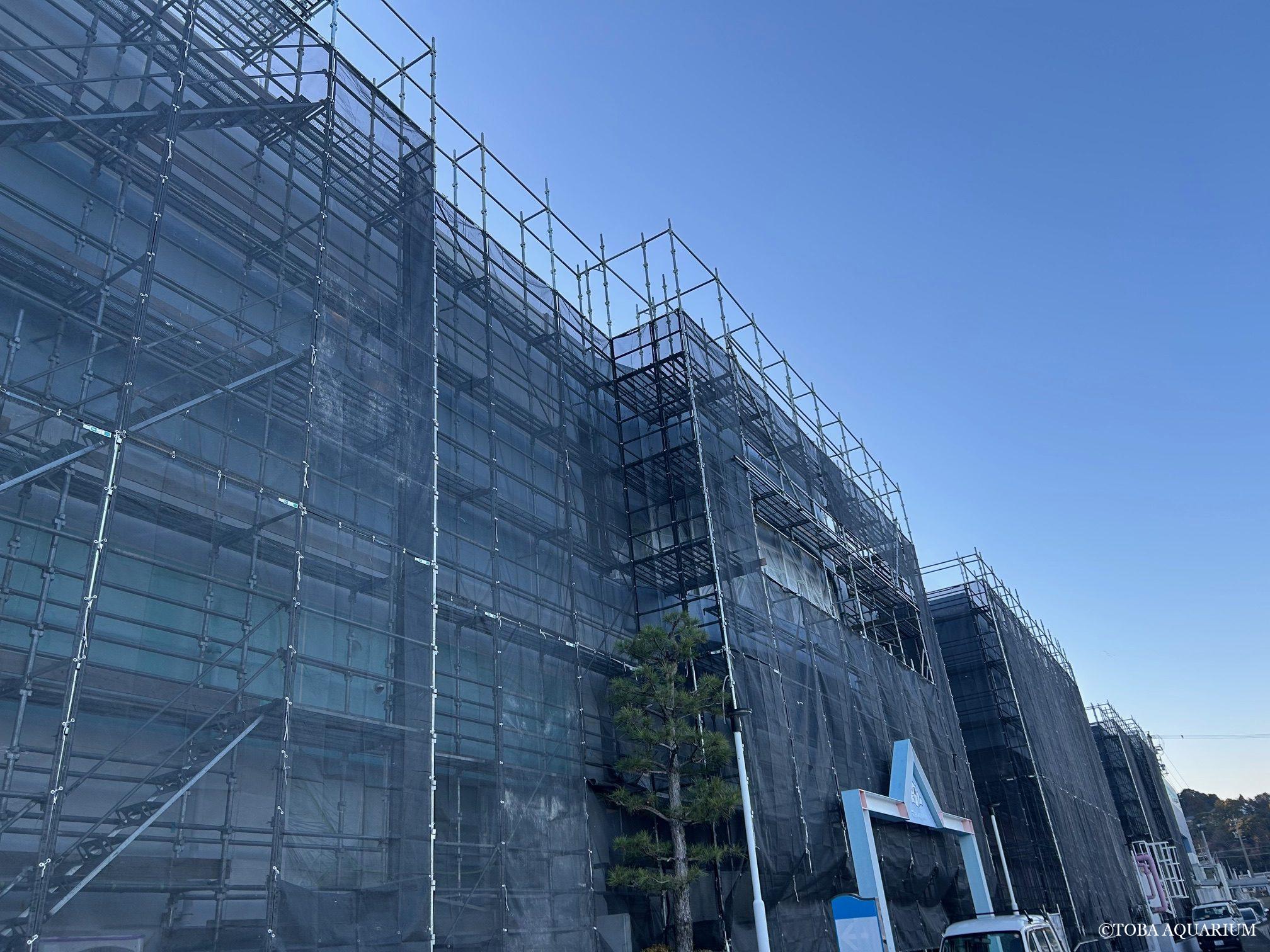 今、鳥羽水族館では外観をきれいに塗り直している工事をしています。 建物の周りがネットで囲われてしまっているので、あのカラフルな外見が駅から歩いてきても目にすることができません。 みなさんにはご迷惑をおかけしています。 ご
