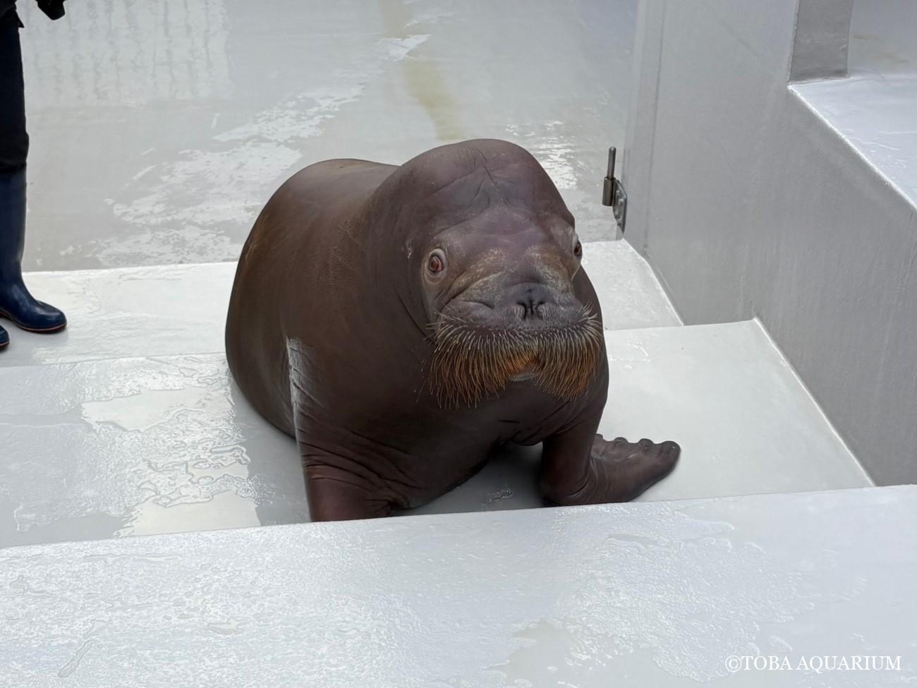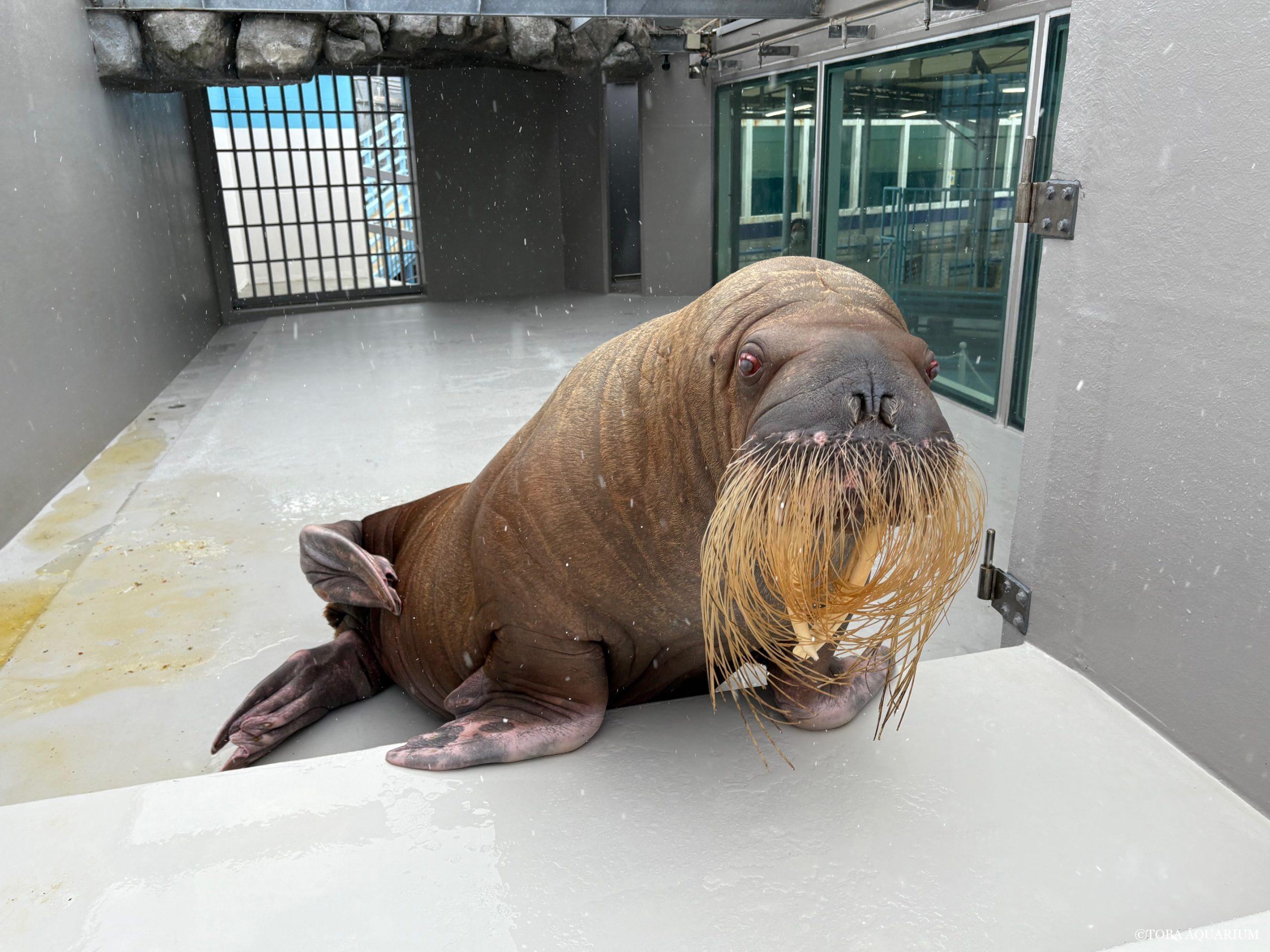 すでにお知らせされている通り、大分県にある「うみたまご」から メスのセイウチ「いちこ」が鳥羽水族館へやって来ました! まずは無事に到着してくれて本当にありがとう。長旅お疲れさまでした。 水槽へ