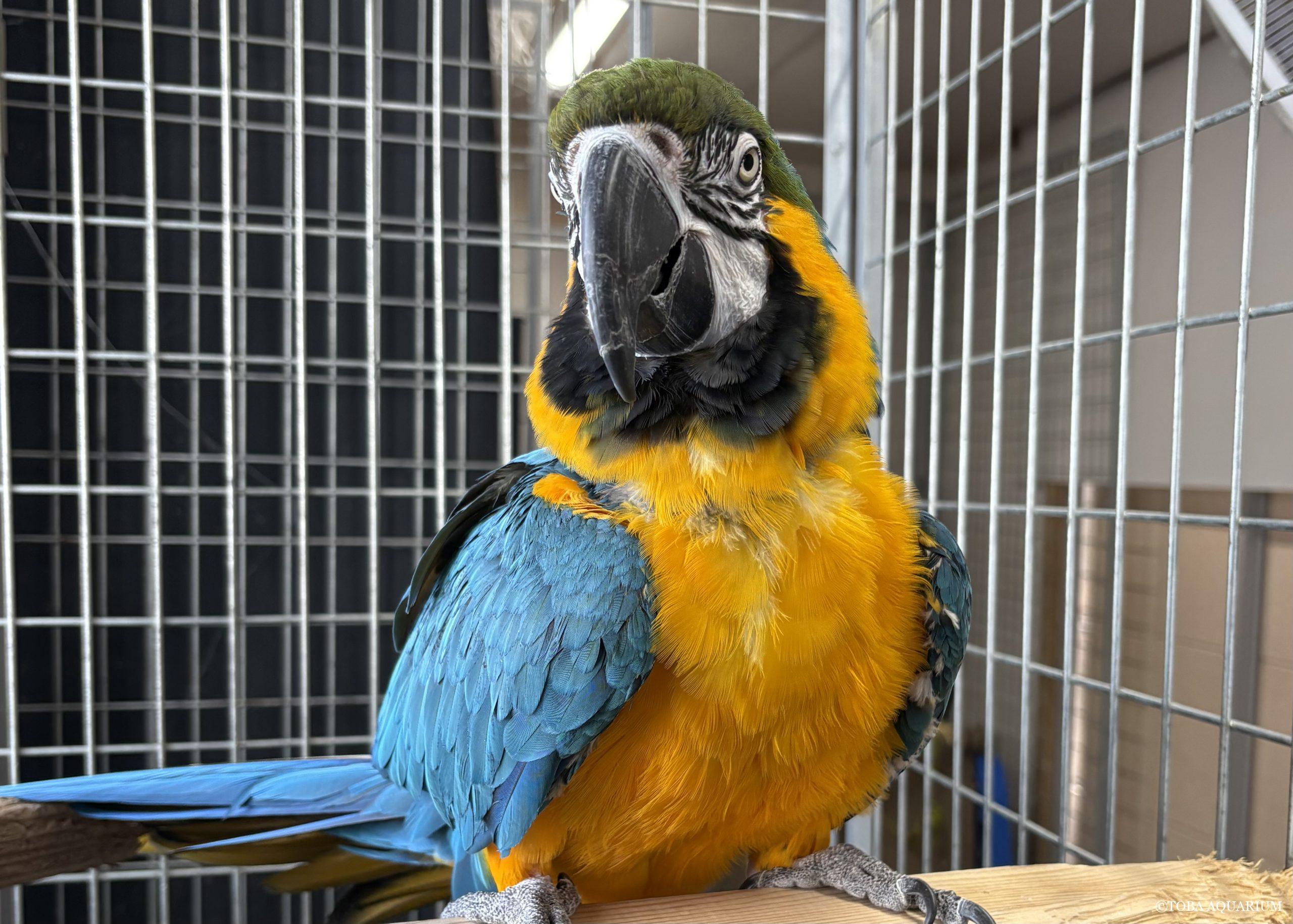 こんにちは!今回はバックヤードで飼育しているこちら! ルリコンゴウインコの「ピースケ」くんをご紹介します! 私、【たに】はピースケくんの担当になってまだ1年くらいなのですが、だんだんと仲良くなってきて色んなことに反応して