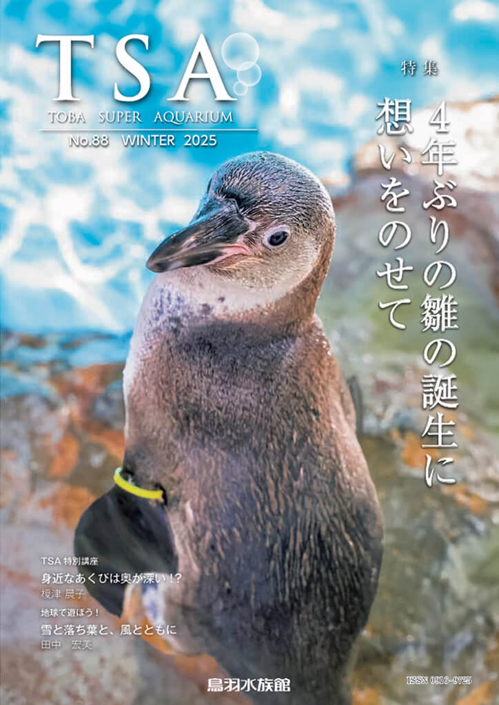Front Essay 街と共生する水族館を目指して三重の水辺紀行83 とめどない好奇心海の生きものたちに会いたくて 83 久しぶりのダイビングわくわく鳥羽水ツアー 第4回 ザリガニ・マリンギャラリー編TSA特別講座52 身近なあくびは奥が深い!?地球で遊ぼう! 47 雪と落ち葉と、風とともに釣りバカ飼育員日記 第24回 マゴチ人魚姫セレナとの日々13 お久しぶりの水槽移動獣医のきもち 47 イヤやなぁ、それでもやるねん!新コーナー 鳥羽水族館の新情報 コーラルリーフダイビングゾーンの水槽をリニューアル!もうヘンなヤツとは言わせない! 29 黒潮大蛇行の終息と久しぶりの再会ウラ話 みんなで作ろう とばすいコレカモノ語り 「ドローン」特別展 貝展 こんなんおったんカイ!トバスイイベント情報