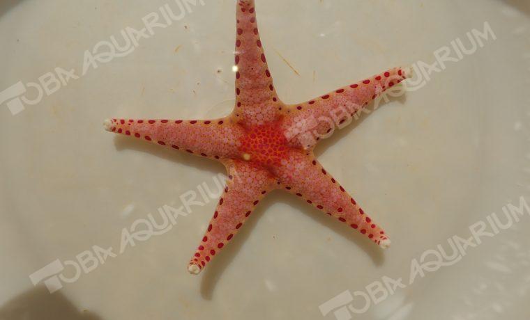 盤の表面は濃赤紫色で、腕の両側縁に赤色の丸い斑紋が並ぶ。