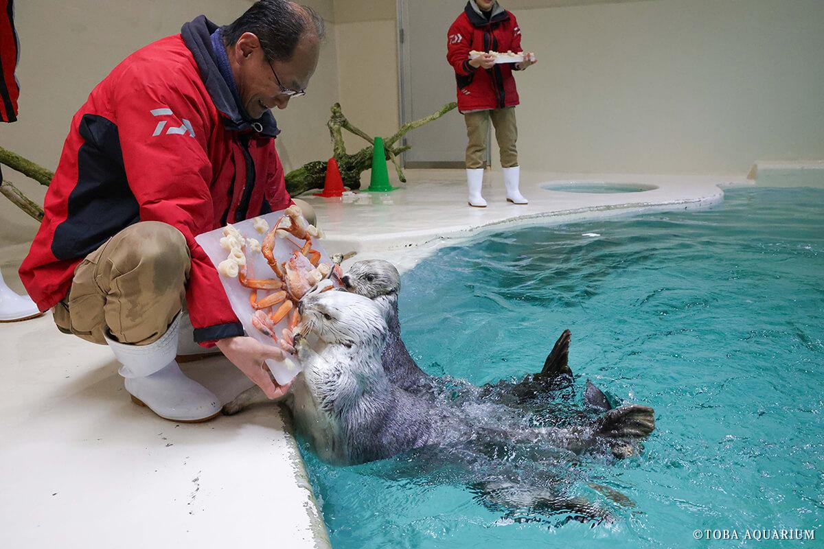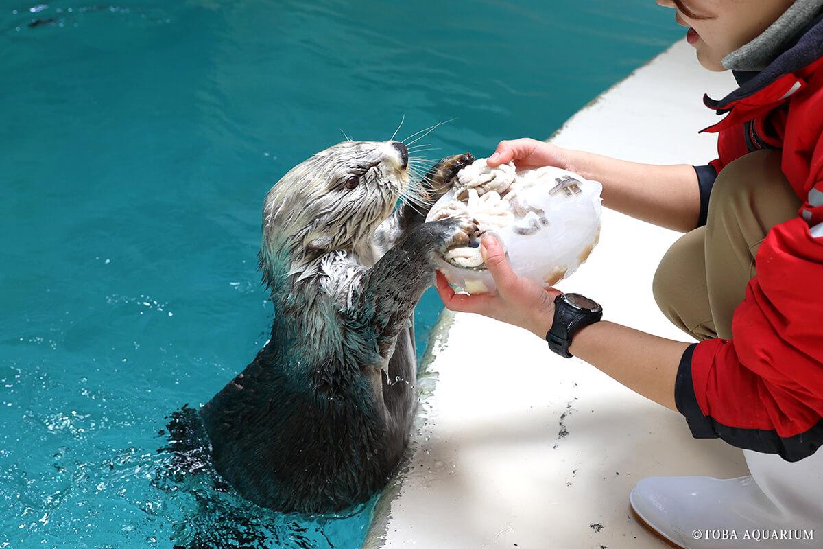飼育係と一緒に、採用されたデザイン案を基にアイスケーキ作りを一部体験していただきます。誕生日当日にご来館が可能な場合は、アイスケーキプレゼントの時間中、ラッコ水槽最前列でケーキを食べる様子を1分間の観覧制限なしでご覧いただけます。