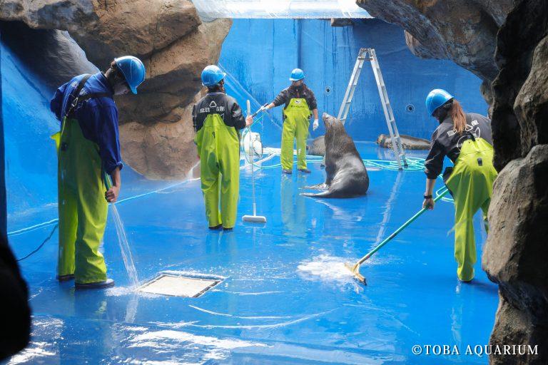 45分ほどかけて約600tもの水が水槽から抜かれたのち、集まった6名の飼育係が水槽の大掃除に取り組みました。デッキブラシやホースを駆使して水槽を掃除する飼育係の姿に、水槽内のカリフォルニアアシカをはじめミナミアフリカオットセイやハイイロアザラシたちは興味津々の様子でした。